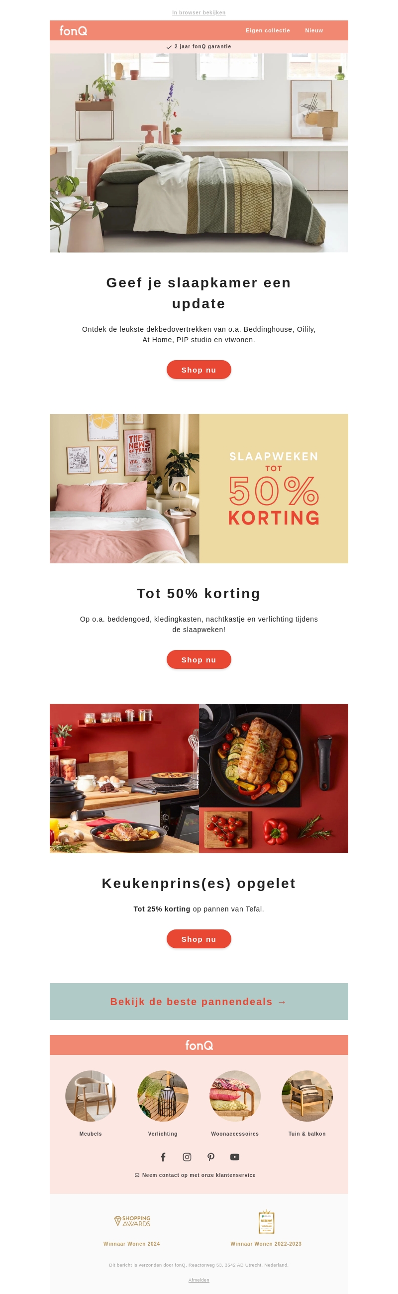 Ontdek de leukste dekbedovertrekken en meubelstukken om je slaapkamer een frisse look te geven. Profiteer ook van kortingen tot 50% op geselecteerde items tijdens de slaapweken. Mis ook de keur aan keukenproducten niet met tot 25% korting op Tefal pannen.