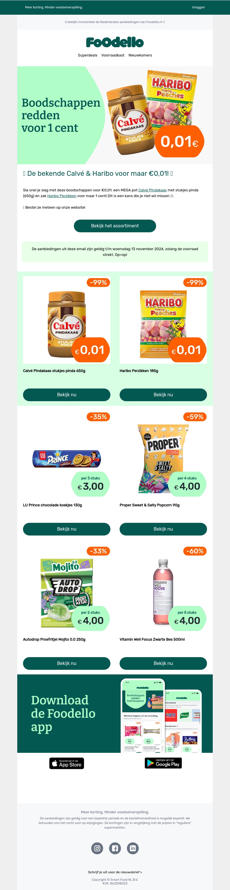 Mis deze mega deals niet! Ontvang een pot Calvé Pindakaas en een zak Haribo Perzikken voor slechts 1 cent. Deze aanbieding is geldig tot 13 november 2024, zolang de voorraad strekt. Bestel nu en bespaar flink! Ontdek ook andere aantrekkelijke kortingen op lekkernijen zoals LU Prince koekjes en Vitamin Well Zwarte Bes drankjes.