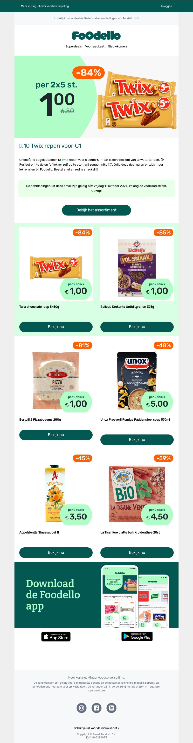 Ontdek een ongelooflijke korting op Twix repen bij Foodello! Voor maar €1 ontvang je 10 repen, perfect om te delen of zelf van te genieten. Deze aanbieding geldt tot en met 1 oktober 2023 en op=op. Mis deze kans niet!