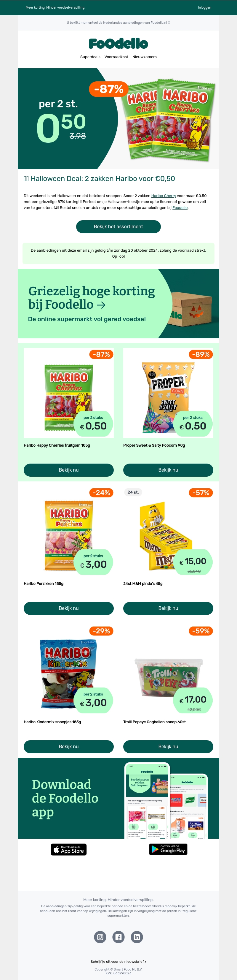 Grijp deze Halloween deal bij Foodello. Twee zakken Haribo Cherry voor slechts €0,50, een besparing van 87%. Deze aanbieding is geldig tot en met 20 oktober 2024, zolang de voorraad strekt. Perfect voor een feestje of gewoon heerlijk snoepen. Geniet van andere kortingen op snacks bij Foodello. Op=op, dus wees er snel bij!