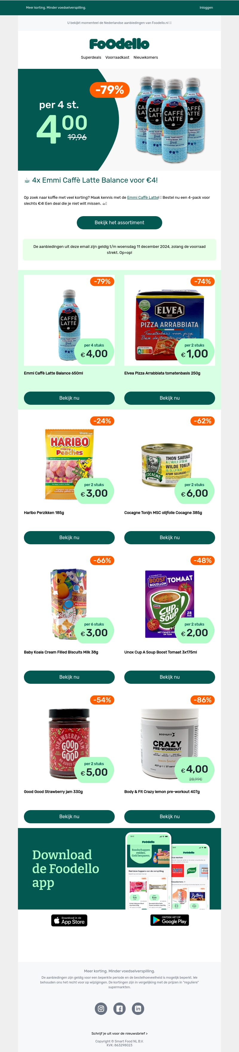 Haal nu vier flessen Emmi Caffè Latte voor slechts €4 en geniet van een flinke korting van 79%! Verlies geen tijd en profiteer van deze geweldige aanbieding. Daarnaast vind je ook andere voordelige producten zoals Elvea Pizza Arrabbiata en Unox Cup-a-Soup. Mis deze kans niet om te besparen op je favoriete items.