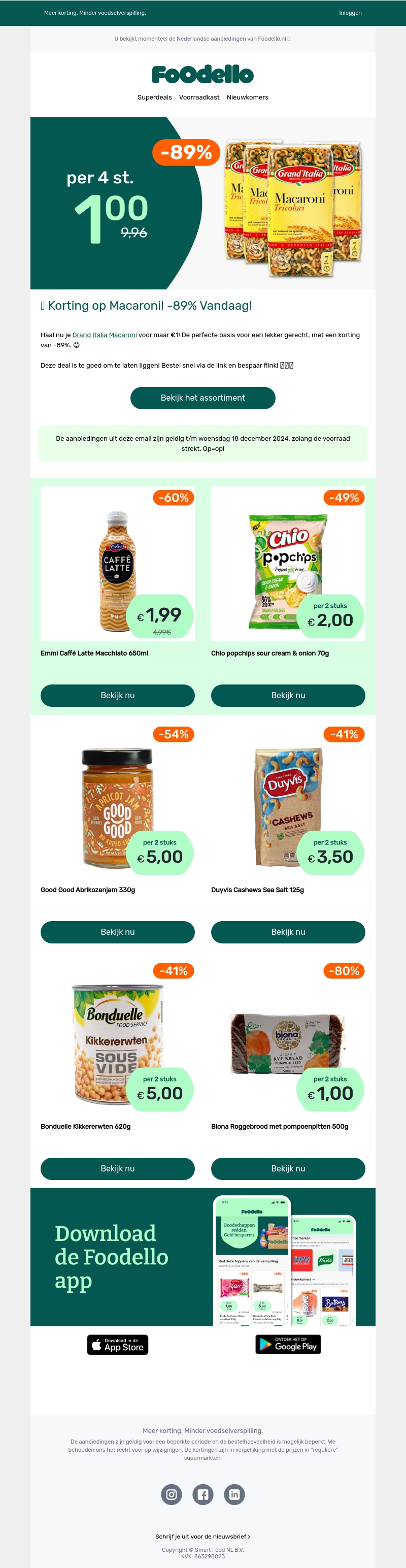 Ontvang nu een ongelooflijke korting op Grand Italia Macaroni! Koop 4 stuks voor slechts €1, wat neerkomt op een besparing van 89% op de originele prijs. Perfect voor een heerlijke maaltijd. De aanbieding is geldig tot en met 18 december 2024, zolang de voorraad strekt. Mis deze superdeal niet en sla je voorraad in!