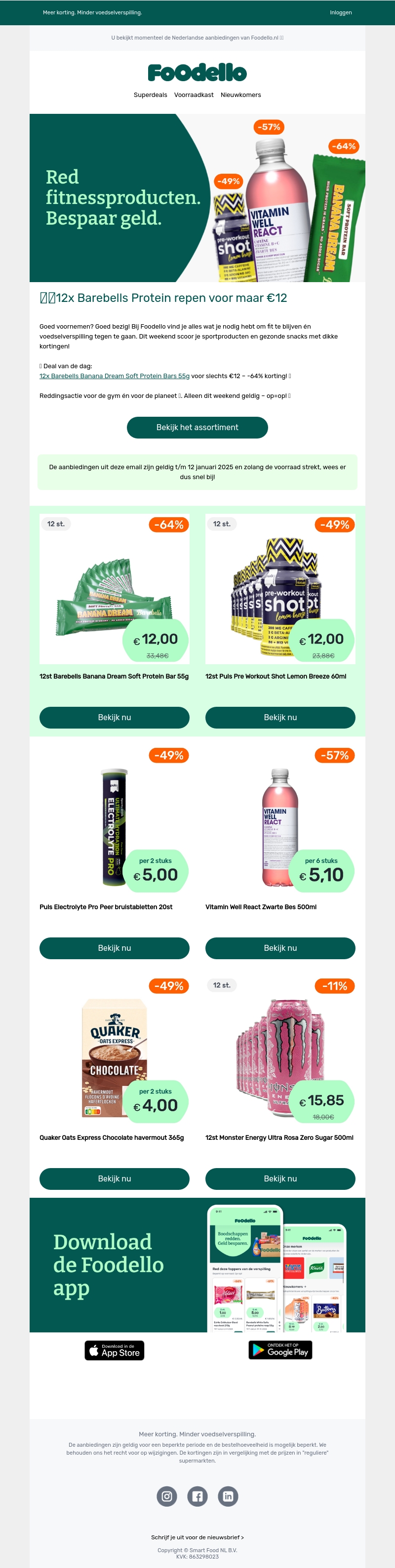 Profiteer van deze geweldige aanbieding bij Foodello. Ontvang een 12-pack Barebells eiwitrepen voor slechts €12, een korting van maar liefst 64%. Perfect voor een gezonde snackoptie! Deze aanbieding is alleen geldig dit weekend, dus wees er snel bij!