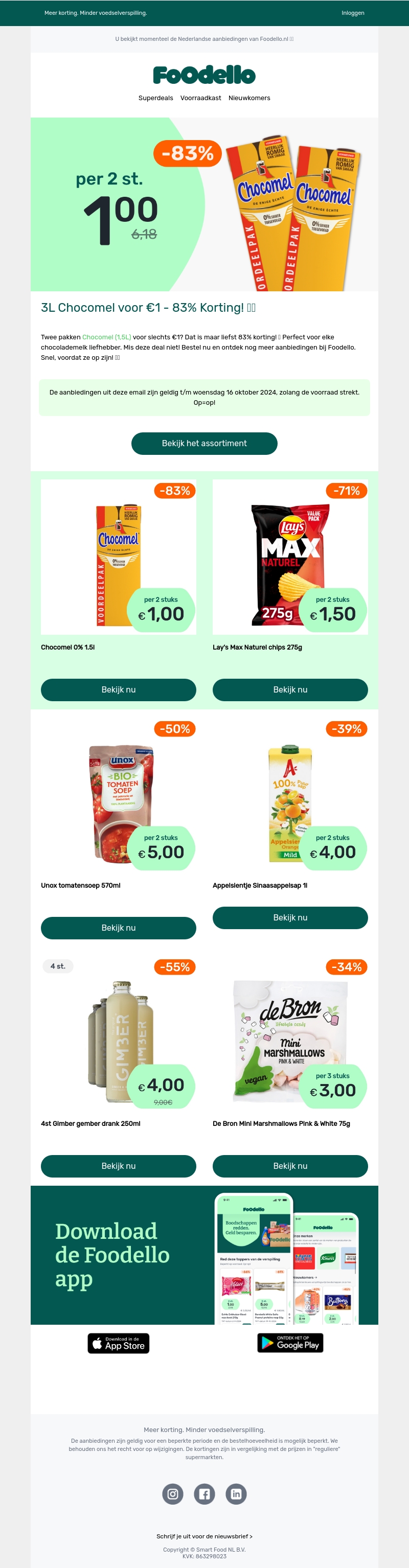 Ontdek de superdeal van Foodello met Chocomel! Koop twee pakken van 1,5L voor slechts €1 en geniet van een korting van 83%. Deze aanbieding is perfect voor chocolademelk liefhebbers. Wees er snel bij, want de actie geldt zolang de voorraad strekt. Bestel nu en mis deze kans niet!