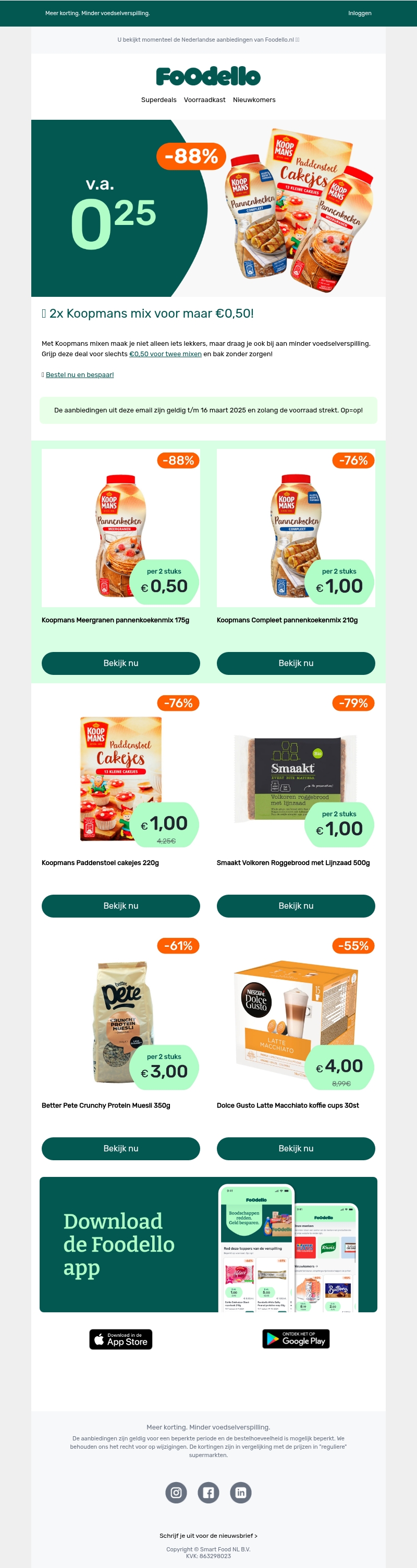 Grijp je kans met de geweldige aanbieding op Koopmans mixen. Koop nu 2 voor de prijs van €0,50 en geniet van heerlijke pannenkoeken of cakejes. Deze promotie is slechts geldig tot 16 maart 2025, dus sla snel je slag! Daarnaast vind je ook andere fantastische deals zoals Dolce Gusto koffie en Better Pete Protein Muesli. Mis deze kans niet om te besparen!