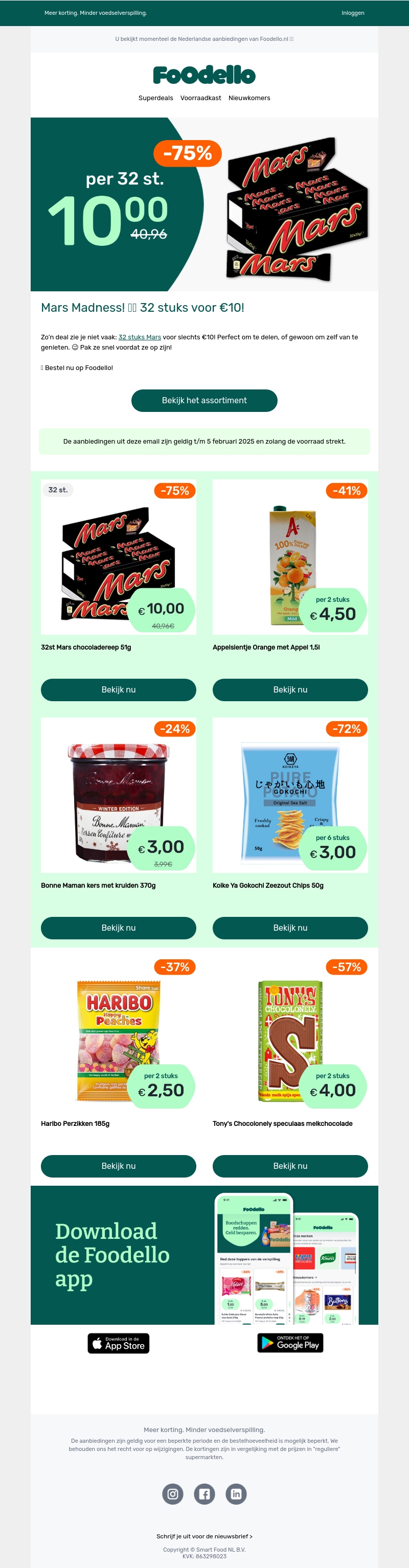 Deze geweldige aanbieding van Foodello biedt je 32 Mars-repen voor maar €10. Geniet van een besparing van 75% op de normale prijs. Wees er snel bij, want op is op! Bekijk ons assortiment voor nog meer fantastische deals en exclusieve kortingen. Vergeet niet onze app te downloaden voor eenvoudig winkelen.