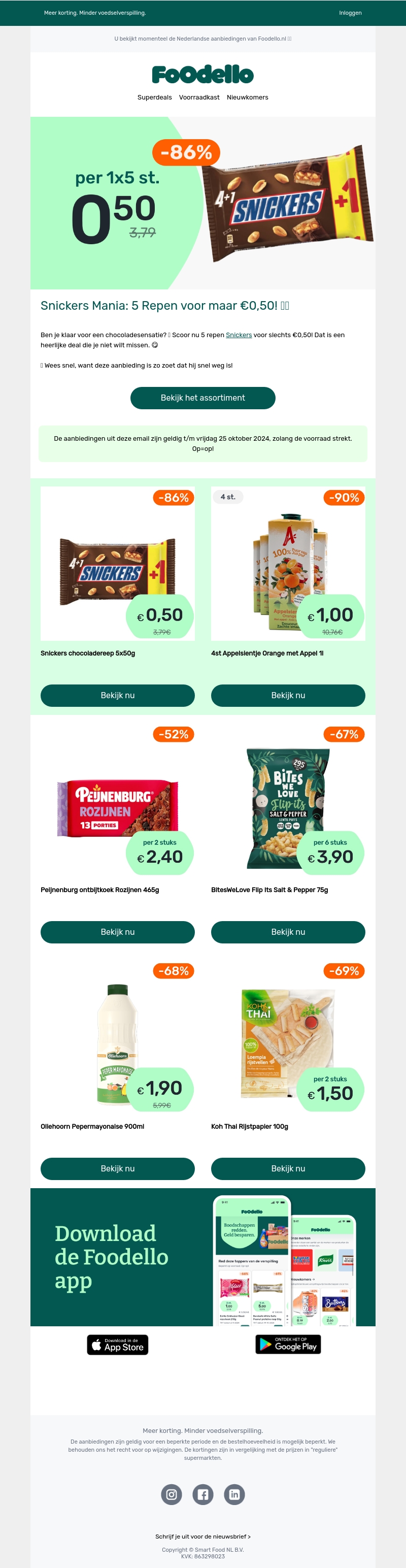 Mis deze ongelooflijke aanbieding niet: 5 Snickers-repen voor slechts €0,50! Geniet van de zoete chocolade en nootachtige bite die je kent en waar je van houdt. Wees er snel bij, want op is op. Ontdek ook andere fantastische deals, zoals Peijnenburg Ontbijtkoek en BitesWeLove Flip Its.