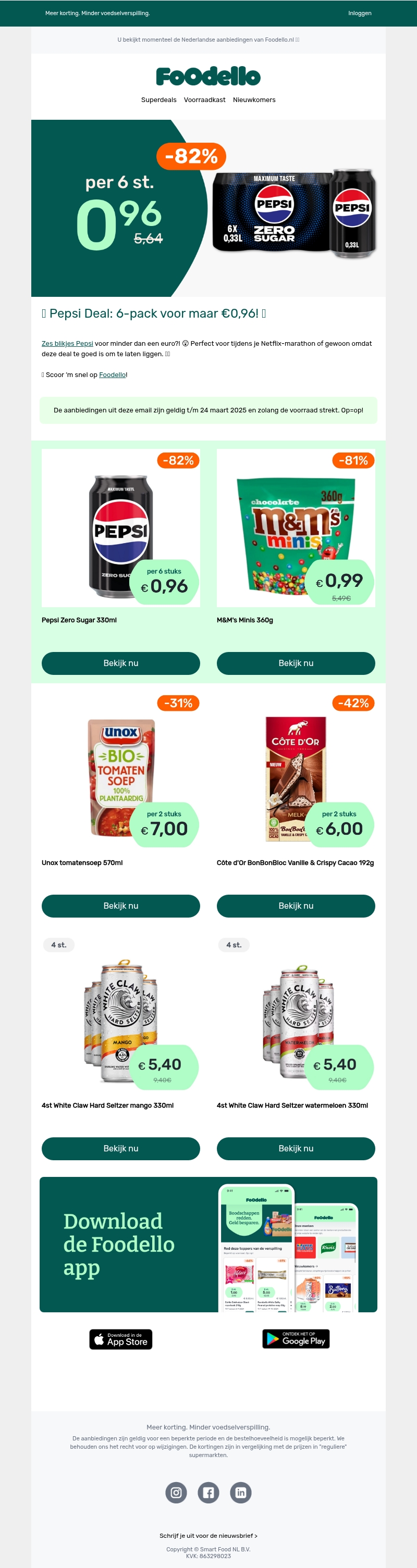 Mis deze geweldige aanbieding niet: een 6-pack Pepsi voor minder dan een euro! Perfect voor je volgende filmavond of om je voorraadkast aan te vullen. Ook M&M's Minis en White Claw Hard Seltzer zijn sterk afgeprijsd. De aanbieding geldt tot 24 maart 2025 en zolang de voorraad strekt. Sla nu je slag bij Foodello!