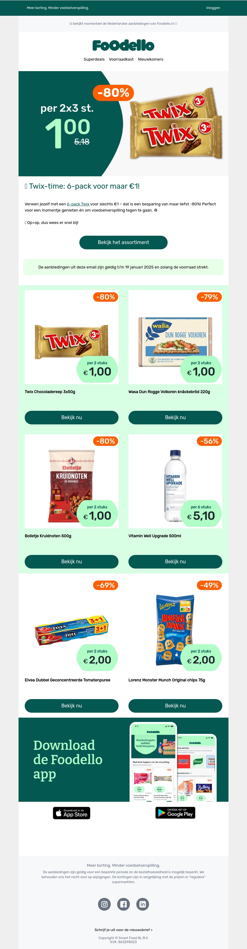 Geniet van een heerlijke 6-pack Twix voor maar €1 bij Foodello. Dit is een fantastische besparing van maar liefst 80%! Perfect voor een zoet momentje zonder schuldgevoel. Wees er snel bij, zolang de voorraad strekt. Deze aanbieding is geldig t/m 19 januari 2025.