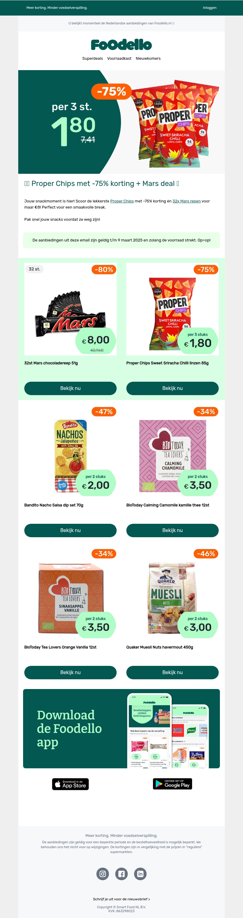 Ontdek de smakelijke aanbiedingen bij Foodello met tot wel 75% korting op Proper Chips. Profiteer van deze onweerstaanbare deals en krijg ook 80% korting op Mars repen! Daarnaast zijn er kortingen op nacho's, thee en muesli. Grijp je kans en bespaar terwijl je geniet van je favoriete snacks en producten. Bekijk de volledige selectie op Foodello.