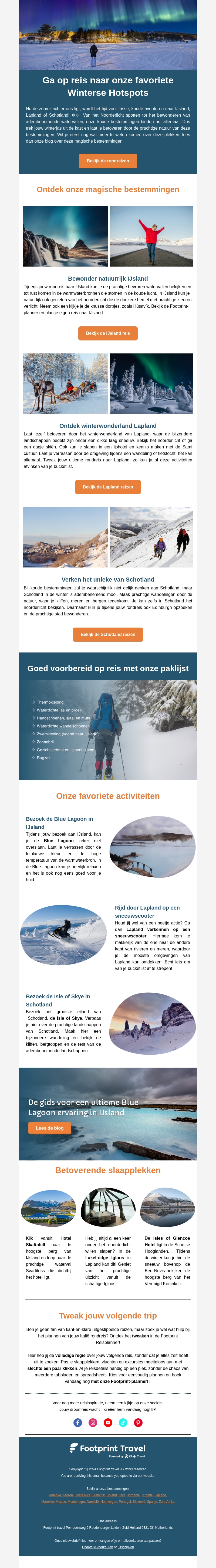 Ga op reis naar onze favoriete winterse hotspots en ontdek de magie van betoverende bestemmingen als IJsland, Lapland en Schotland. Geniet van unieke activiteiten, zoals het bezoeken van de Blue Lagoon en sneeuwscootertochten. Bereid je goed voor met onze handige paklijst!