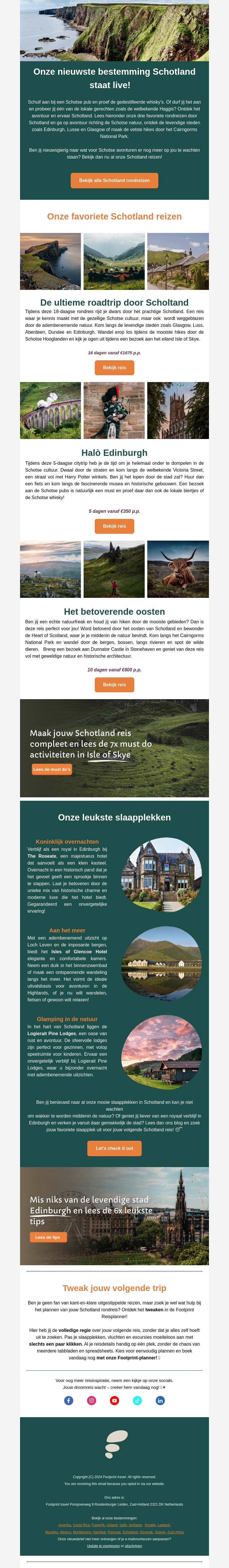 Schotland is live! Ontdek de magische schoonheid van Schotland met onze nieuwe rondreizen. Bezoek iconische plekken zoals Edinburgh en de Hooglanden. Plan je ultieme roadtrip of fijne stedentrip. Lees ook over de leukste slaapplaatsen voor een unieke ervaring.