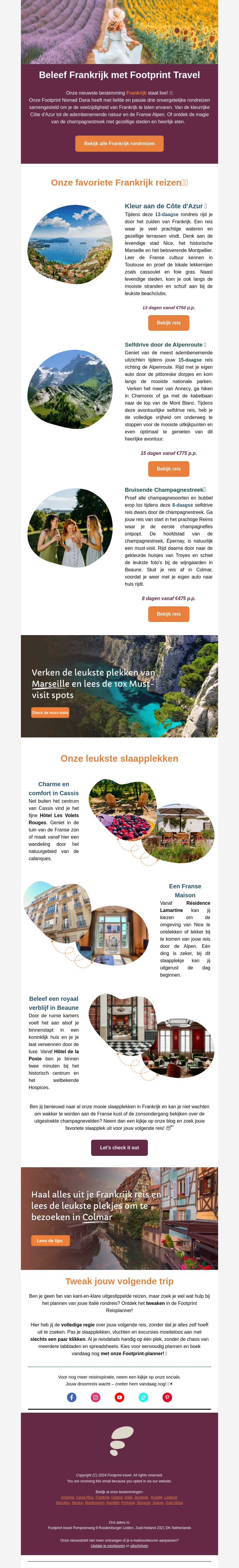 Ontdek de mooiste bestemmingen in Frankrijk met Footprint Travel. Bezoek de Côte d'Azur, de Alpen, Champagne en meer. Profiteer van onze exclusieve aanbiedingen en beleef een onvergetelijke vakantie vol avonturen, rust en heerlijke culinaire ervaringen.