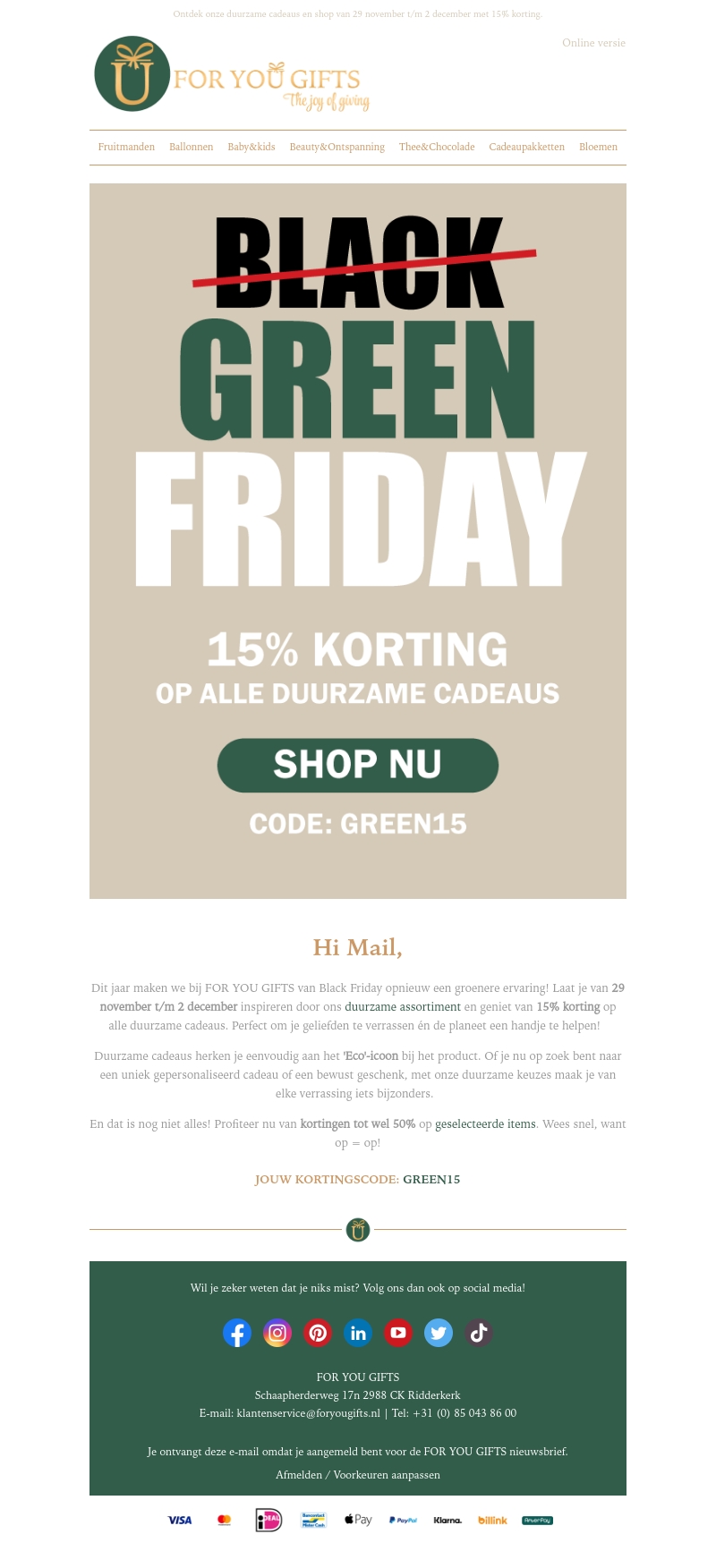 Beleef een groenere ervaring met onze Green Friday aanbieding. Van 29 november t/m 2 december geven we 15% korting op ons volledige duurzame assortiment. Laat je inspireren en kies uit unieke en milieuvriendelijke cadeaus. Profiteer van extra kortingen tot 50% op geselecteerde items. Wees er snel bij, want op = op!