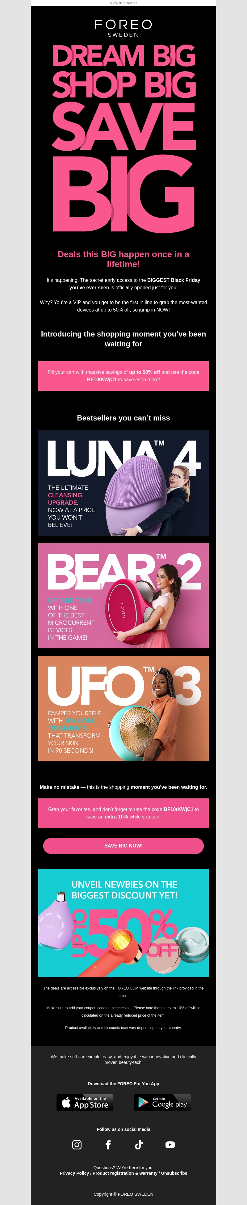Mis deze kans niet! Onze geheime Black Friday sale biedt u de kans om tot 50% te besparen op de meest begeerde apparaten. Gebruik de code BFI10KWC1 om nog meer te sparen. Ontdek de FOREO bestsellers zoals de LUNA 4 en UFO 3. Bereid u voor om groot te winkelen en groot te besparen!