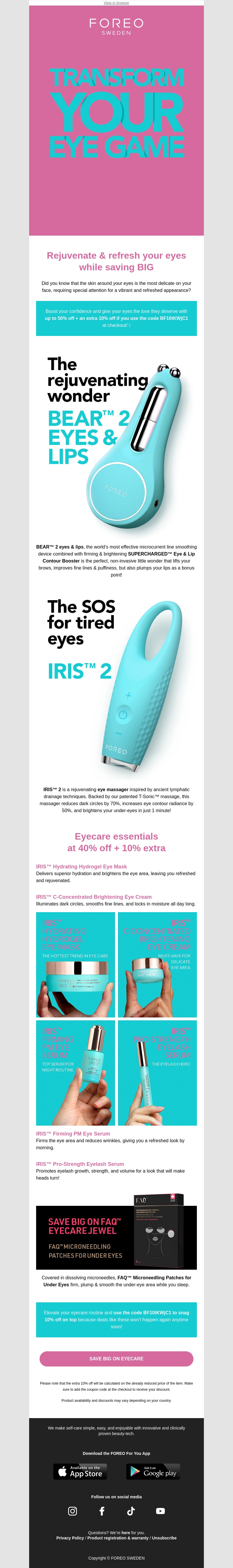 Verwen je ogen met geweldige kortingen tijdens de Black Friday verkoop! Bespaar tot 50% op oogverzorgingsproducten zoals de BEAR™ 2 en IRIS™ 2. Transformeer je oogverzorgingsroutine met innovatieve apparaten en formules. Mis deze kans niet om jouw oogverzorging naar een hoger niveau te tillen met indrukwekkende besparingen.