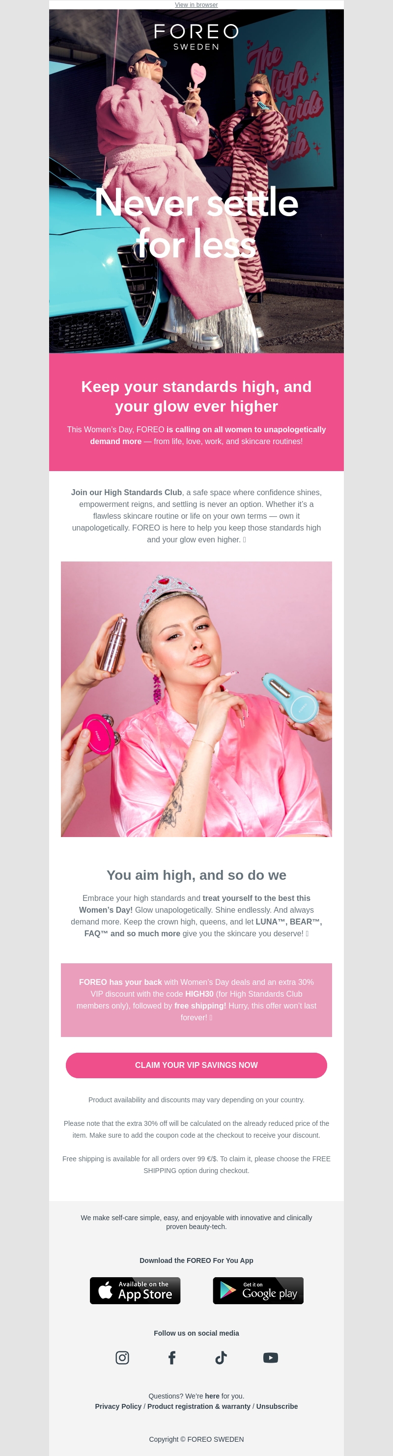 Doe mee met de High Standards Club van FOREO en ontdek een wereld waar hoge standaarden de norm zijn. Deze Women's Day, straal je ongeëvenaard en profiteer van exclusieve VIP-kortingen. Laat LUNA™, BEAR™, FAQ™, en meer je helpen om je beste gloed te bereiken. Gebruik de code HIGH30 voor 30% korting en gratis verzending.