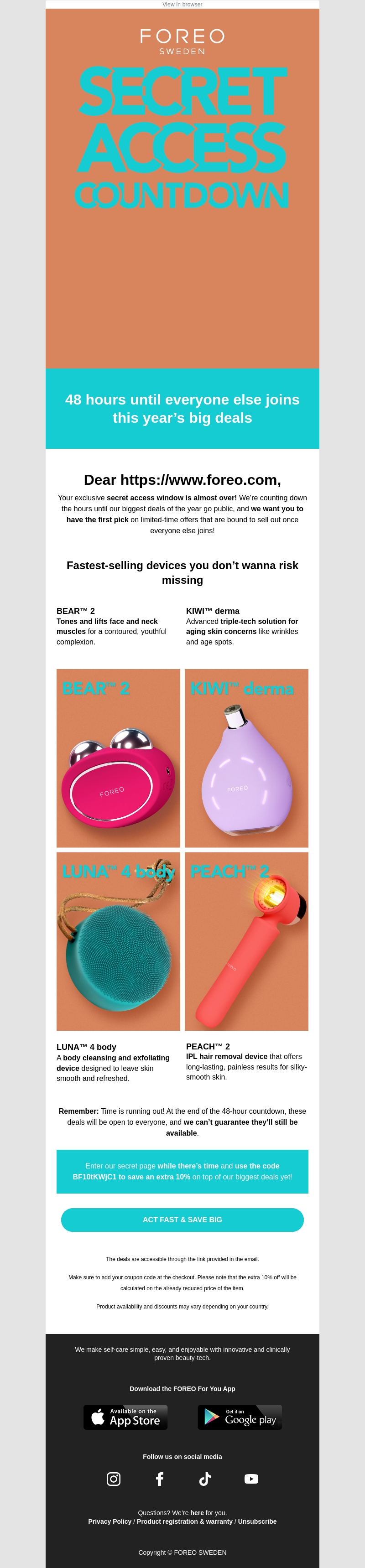 Krijg toegang tot FOREO's geheime aanbiedingen voordat iedereen meedoet. Ontdek onze snelst verkopende apparaten zoals BEAR™ 2 en KIWI™ derma. Vergeet niet je couponcode te gebruiken voor extra korting. Deze aanbiedingen zijn slechts tijdelijk beschikbaar!