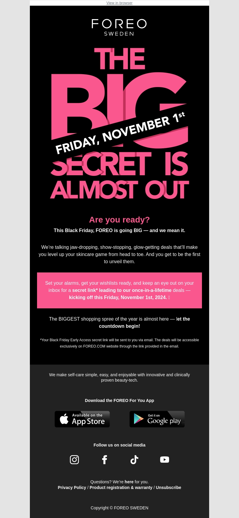 Deze Black Friday brengt FOREO spectaculaire en baanbrekende deals. Verbeter je huidverzorgingsroutine met buitengewone kortingen die jouw gloed een boost geven. Wees de eerste die onze exclusieve aanbiedingen ontdekt.