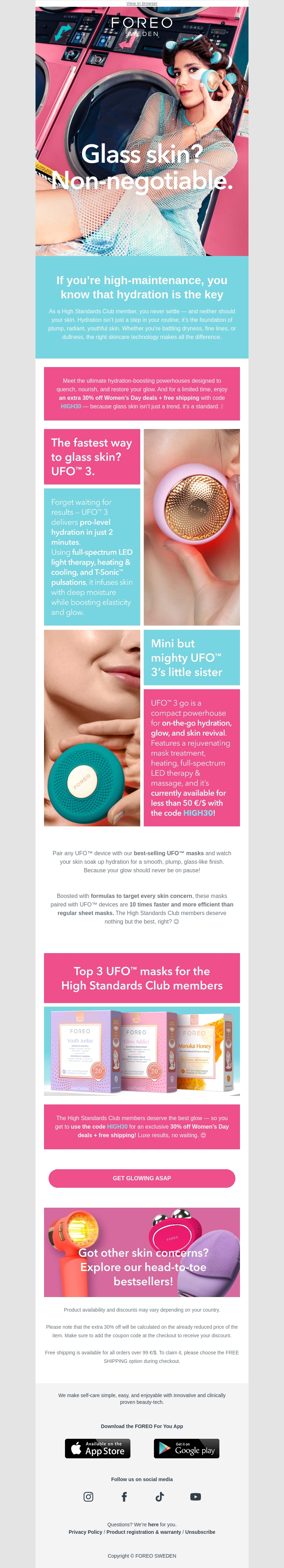 Word lid van The High Standards Club en ervaar de ultieme huidverzorging. Met FOREO's pro-level hydratatie in slechts twee minuten, garandeert UFO™ 3 een stralende huid. Profiteer van 30% korting op Women's Day deals met code HIGH30. Mis de kans niet om jouw huid tot bloei te laten komen!