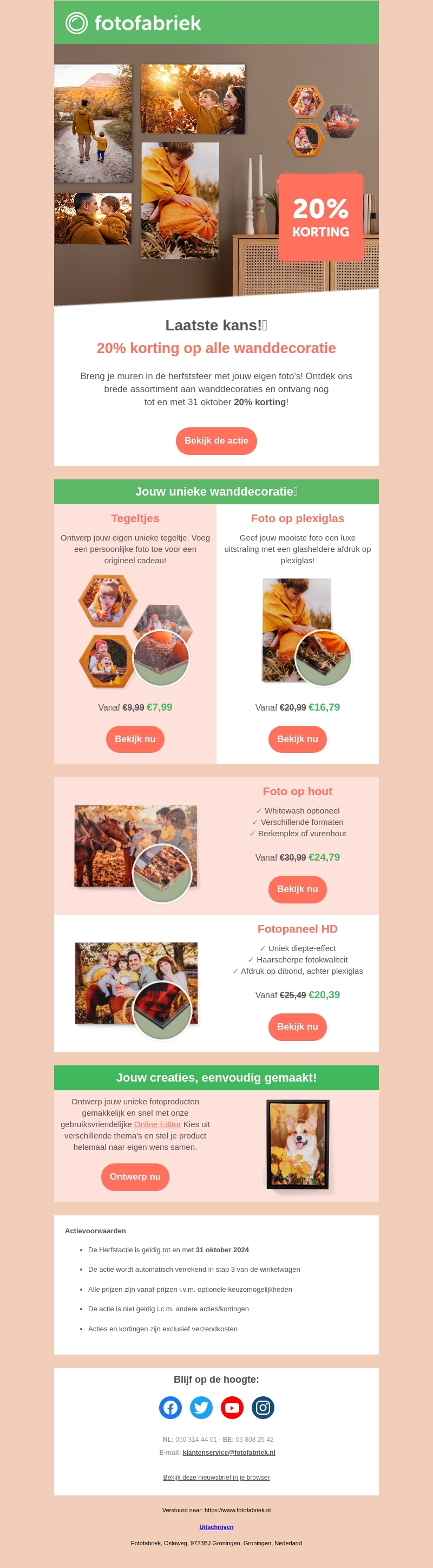 Profiteer van een speciale herfstaandbieding met 20% korting op alle wanddecoraties bij Fotofabriek. Ontdek ons assortiment van tegelprints en plexiglas tot fotopanelen en meer, en geef je huis een frisse look. Deze actie is geldig tot en met 31 oktober 2024, dus mis het niet!