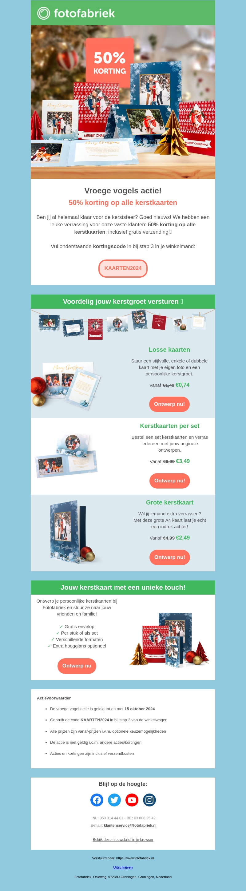 Bereid je voor op de kerst en profiteer nu van 50% korting op alle kerstkaarten bij Fotofabriek. Of je nu losse kaarten, sets of grote A4-kaarten wilt versturen, je kunt ze eenvoudig ontwerpen met je eigen foto. Gebruik de kortingscode KAARTEN2024 bij het afrekenen en geniet van gratis verzending.