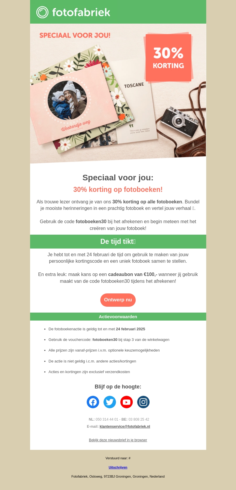 Speciaal voor jou van Fotofabriek: 30% korting op alle fotoboeken. Bewaar je mooiste herinneringen in een prachtig fotoboek. Gebruik de code fotoboeken30 bij het afrekenen. Deze aanbieding geldt tot 24 februari 2025. Creëer jouw unieke boek en maak kans op een cadeaubon ter waarde van €100.