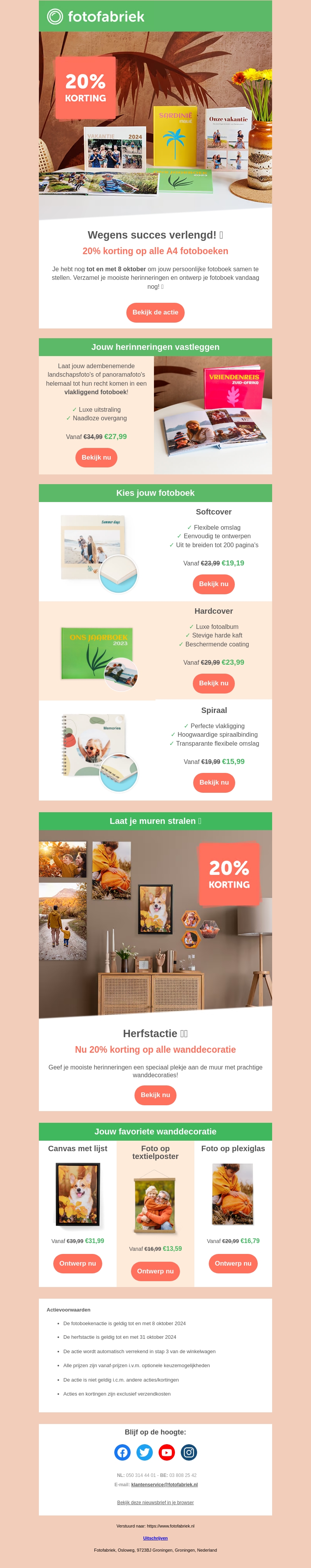 Ontvang 20% korting op alle wanddecoratie bij Fotofabriek. Maak je muren stralend met prachtige fotoproducten. Geldig tot 31 oktober 2024. Zoek een passend fotoboek of ontwerp zelf een canvas, poster of plexiglas foto.