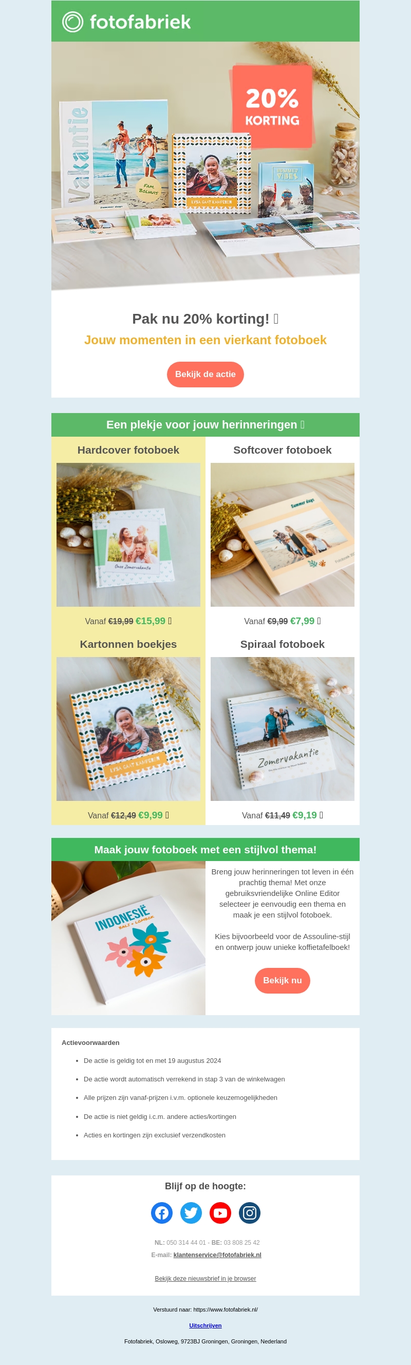 Geniet nu van 20% korting op verschillende soorten fotoboeken bij Fotofabriek. Kies uit hardcover, softcover, kartonnen boekjes of een spiraal fotoboek om jouw speciale momenten te bewaren. Personaliseer jouw fotoboek met stijlvolle thema's en maak het uniek.