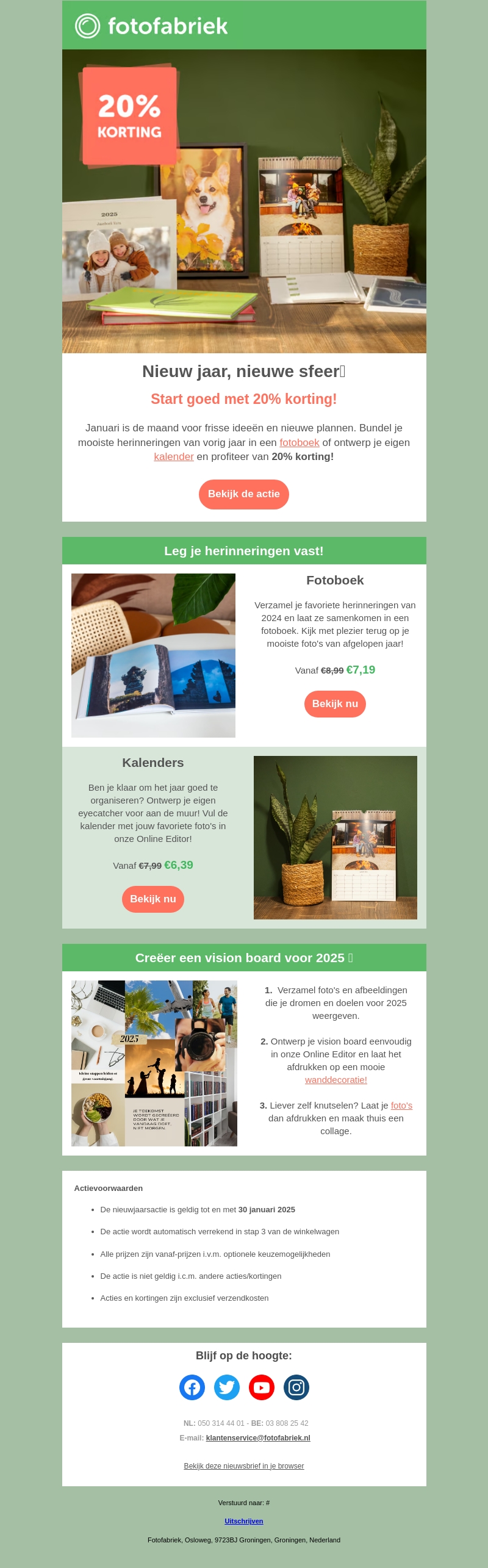 Begin het nieuwe jaar goed met een speciale aanbieding van Fotofabriek. Ontvang 20% korting op fotoboeken en kalenders. Bundel je mooiste herinneringen van vorig jaar in een prachtig boek of ontwerp een persoonlijke kalender. Deze aanbieding is geldig tot 30 januari 2025. Mis deze kans niet om je beste momenten te vereeuwigen!