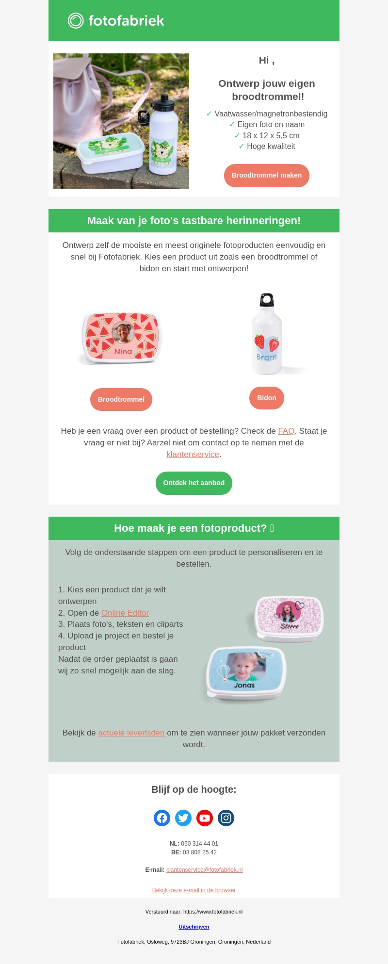 Ontwerp je eigen fotoproducten, zoals broodtrommels en bidons, bij Fotofabriek. Kies je favoriete foto en voeg persoonlijke teksten toe. Ontdek het ontwerpen stap voor stap en start vandaag met het creëren van unieke herinneringen!