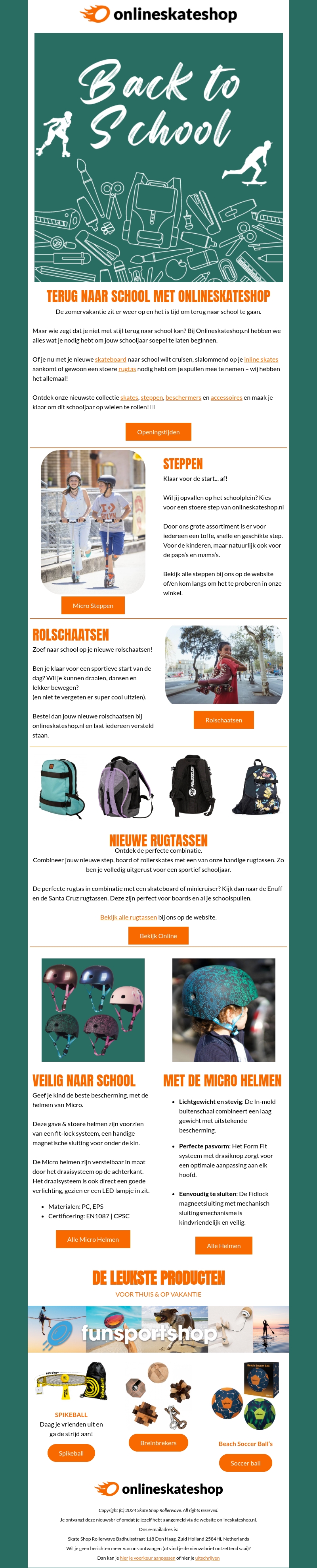 De zomervakantie is voorbij en het is tijd om terug naar school te gaan. Bij Onlineskateshop vind je alles wat je nodig hebt voor een sportieve start van het schooljaar. Kies uit onze nieuwste skates, steppen, rugtassen en beschermers. Maak je klaar om te rollen met stijl en veiligheid!