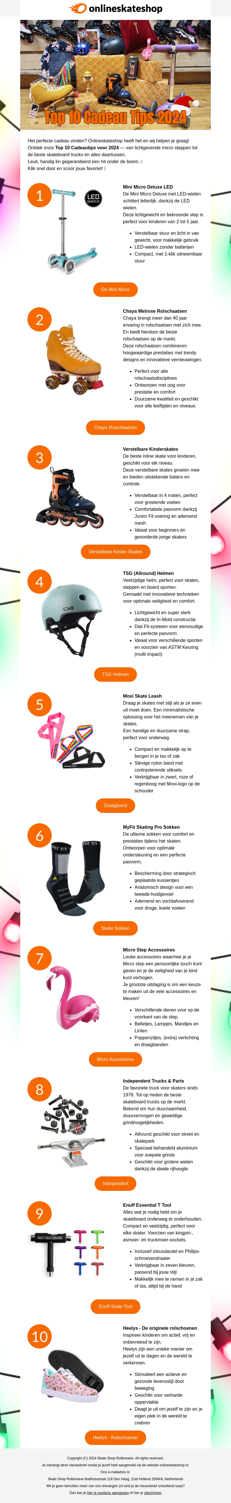Ontdek de top 10 cadeau-ideeΓ«n voor 2024 met diverse producten die perfect zijn voor skateliefhebbers. Van kinderhelmen tot stijlvolle rolschoenen, vind het ideale cadeau voor elke gelegenheid. Laat je inspireren door de nieuwste trends en aanbiedingen van Onlineskateshop.