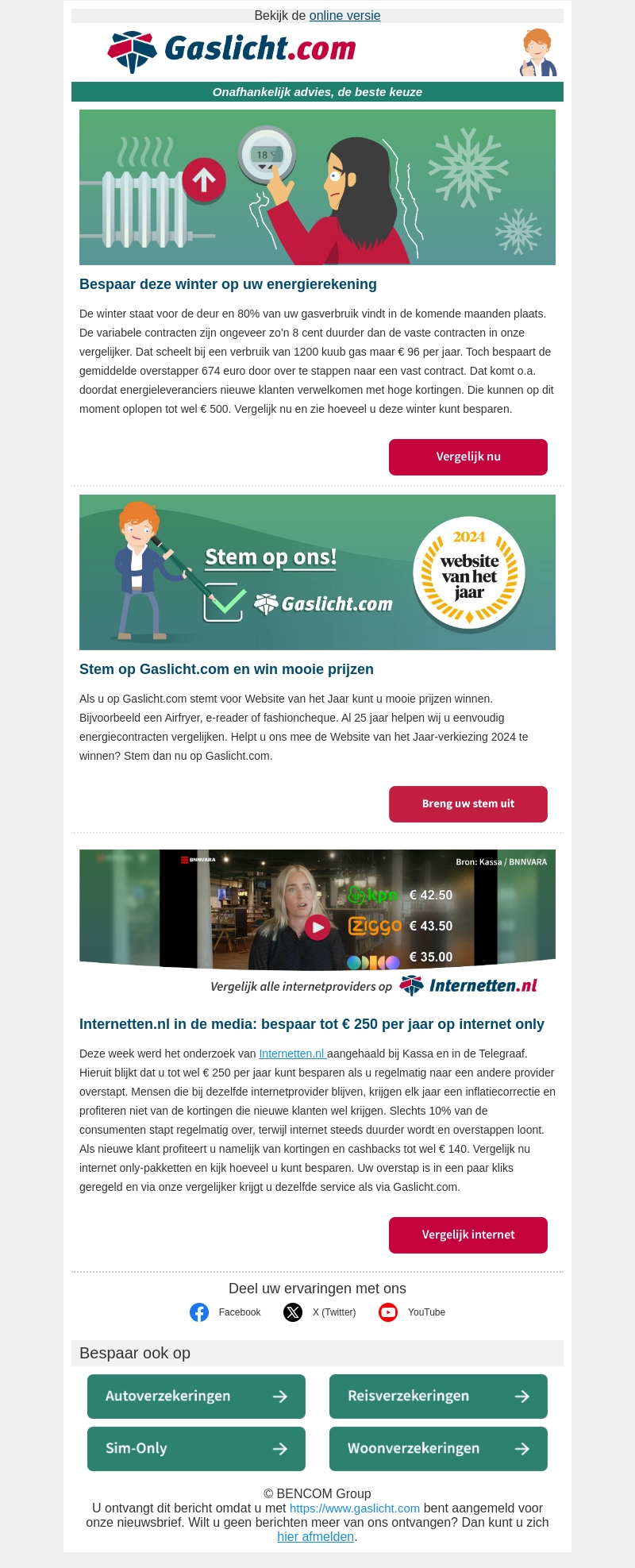 Bespaar deze winter op uw energierekening met Gaslicht.com. Stap over naar een vast contract en bespaar tot wel €674. Vergelijk internetproviders en bespaar tot €250 per jaar. Stem voor Gaslicht.com als Website van het Jaar en win mooie prijzen zoals een Airfryer of fashioncheque.