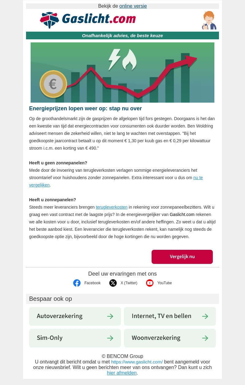 De gasprijzen op de groothandelsmarkt zijn flink gestegen, wat betekent dat het tijd is om na te denken over uw energiecontract. Deskundige Ben Woldring raadt aan om nu over te stappen om te profiteren van lagere tarieven. Vergelijk energieplannen, ongeacht of u zonnepanelen hebt, en bespaar op uw maandelijkse kosten.