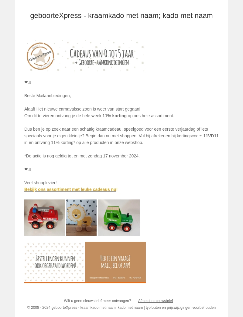 Het carnavalsseizoen is begonnen en dat betekent geweldige aanbiedingen bij GeboorteXpress. Ontvang deze week 11% korting op alle producten in onze webshop. Gebruik bij het afrekenen de kortingscode. De actie loopt tot en met zondag 17 november 2024. Mis het niet en ontdek leuke cadeaus voor kinderen van 0 tot 5 jaar!