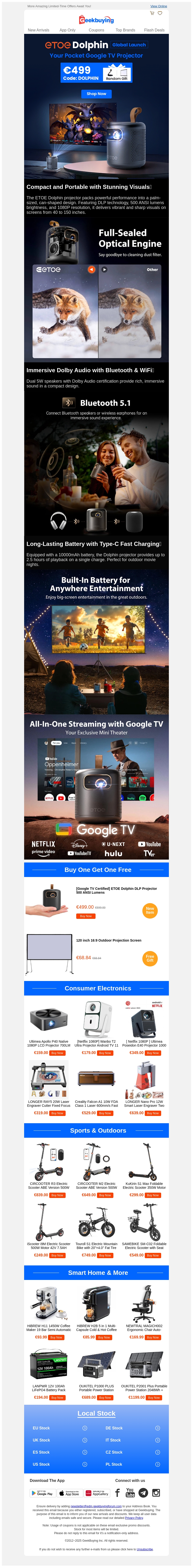 De ETOE Dolphin Projector is nu beschikbaar tegen een geweldige aanbieding: koop één en krijg een gratis cadeau. Deze compacte projector biedt verbluffende visuals en een full-sealed optisch systeem. Bovendien krijg je Bluetooth 5.1 en een duurzame batterij voor optimaal genot. Stream je favoriete shows met geïntegreerde Google TV. Mis deze kans niet om jouw entertainmentervaring een boost te geven.