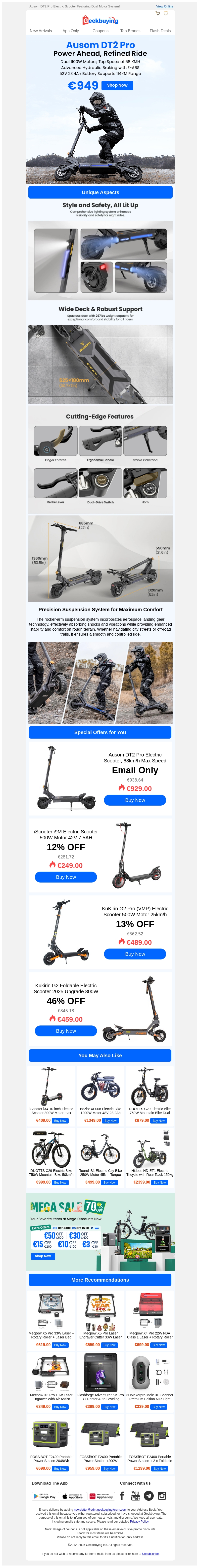 Verken de innovatieve DT2 Pro elektrische scooter en meer in onze nieuwste nieuwsbrief. Profiteer van ongelooflijke kortingen en exclusieve aanbiedingen op diverse elektrische scooters. Mis de Mega Sale niet met kortingen tot 70%. Shop nu en ervaar de kracht van moderne technologie. Ontvang speciale kortingen op geselecteerde producten. Download de app voor een nog betere winkelervaring.