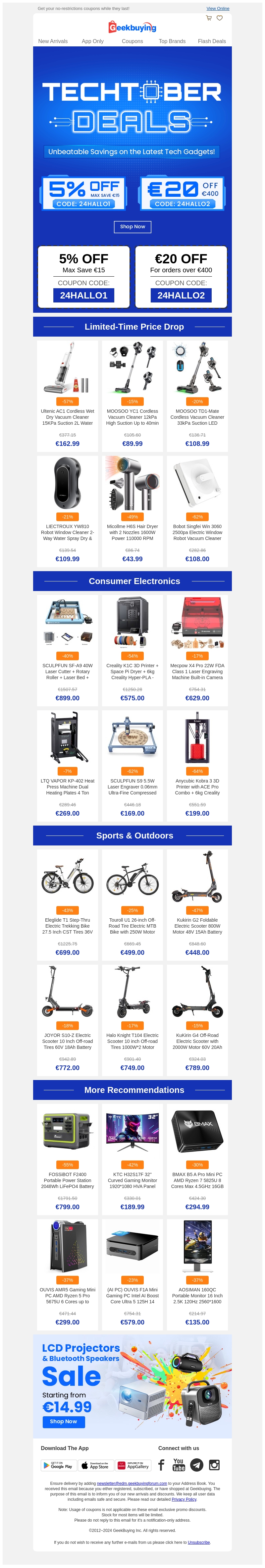 Beleef Techtober met de meest spectaculaire kortingen op technologie! Deze maand bieden we een scala aan gadgets, van e-bikes tot de nieuwste consumentenelektronica. Profiteer nu van kortingen tot 31% en unieke aanbiedingen. Mis deze kans niet om je favoriete techproducten voor minder te krijgen. Voor bestellingen boven โฌ100 en โฌ400 hebben we speciale kortingscodes. Zorg ervoor dat je snel bent, want de voorraden zijn beperkt.