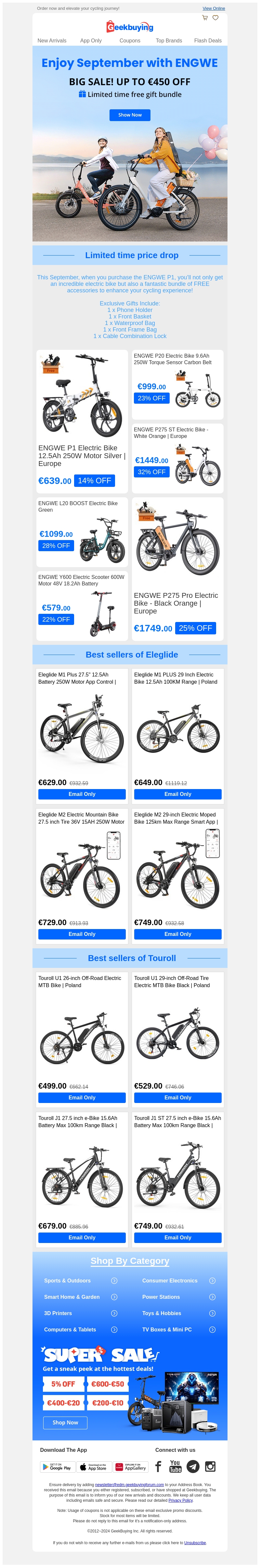 Pak nu deze geweldige kans om jouw fiets te upgraden met ENGWE! Ontvang tot β¬450 korting en geniet van exclusieve gratis cadeauartikelen. Er is een beperkt aantal beschikbaar, dus wacht niet te lang. Klik om meer te weten te komen en profiteer van deze speciale aanbieding in september.