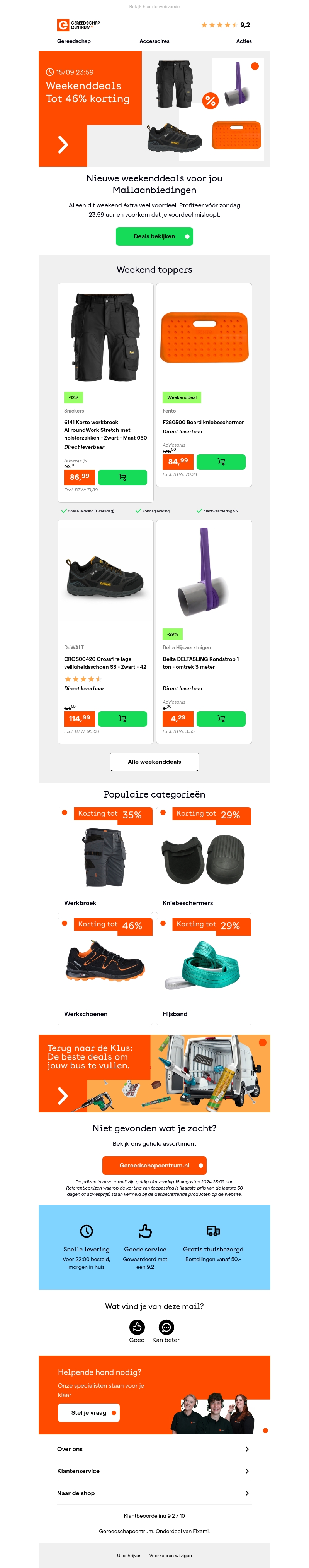 Profiteer van onze geweldige weekenddeals met kortingen tot wel 46%. Alleen dit weekend zijn er speciale aanbiedingen op werkbroeken, kniebeschermers, werkschoenen en meer. Bestel voor zondag 23:59 uur om jouw voordeel te pakken. Mis het niet!