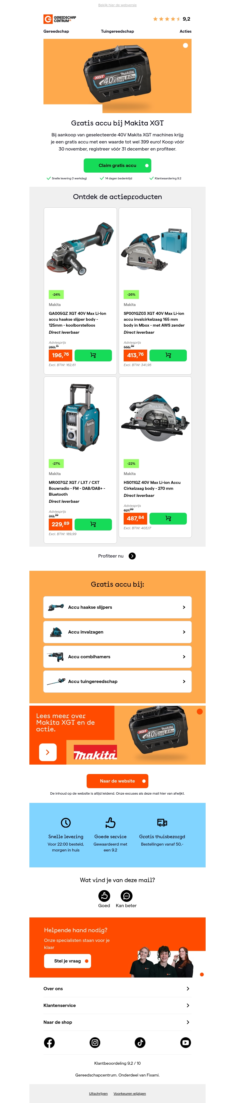 Bij Gereedschapcentrum ontvang je een gratis Makita XGT accu bij aankoop van geselecteerde 40V machines. Deze actie loopt tot 30 november, dus wees er snel bij. Bekijk de actiemodellen en kies jouw favoriete gereedschap. Bestel vandaag nog en profiteer van gratis levering. Met een klantbeoordeling van 9,2 ben je verzekerd van topkwaliteit. Mis deze kans niet om je gereedschapscollectie uit te breiden!