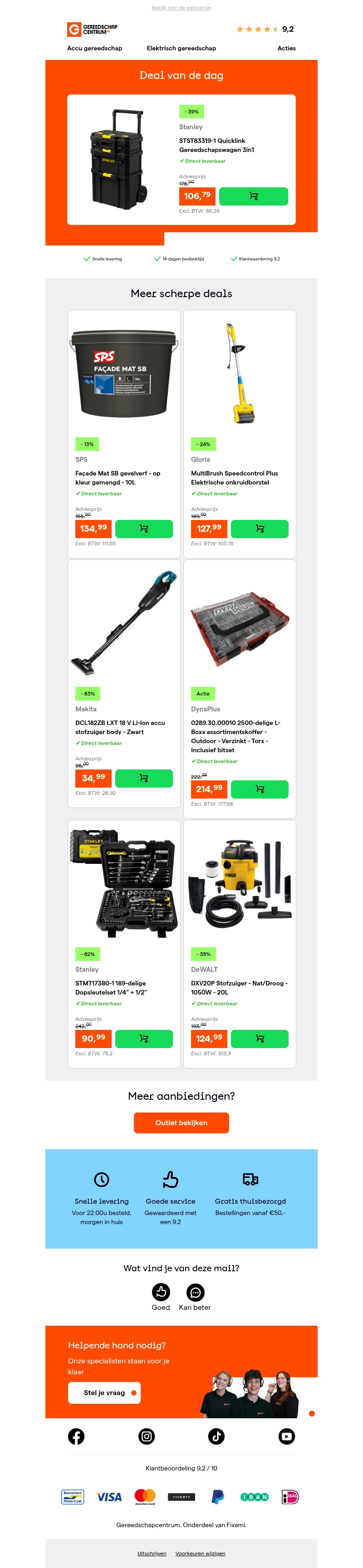 Ontdek de deal van de dag en bespaar 39% op de veelzijdige Stanley STST83319-1 Quicklink Gereedschapswagen 3in1. Deze praktische opbergoplossing biedt maximale flexibiliteit voor al je gereedschappen. Bekijk ook andere scherpe aanbiedingen van topmerken zoals SPS en Makita.