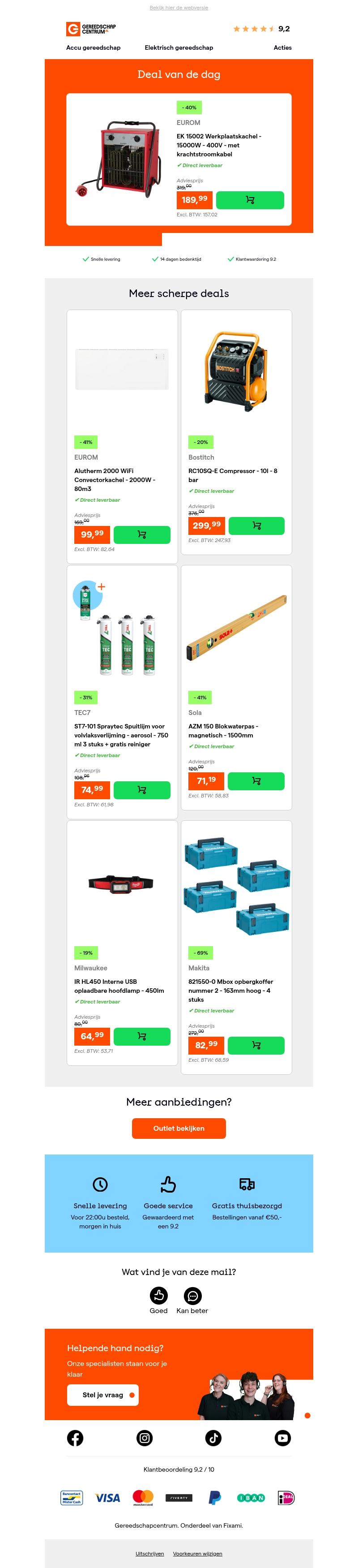 Ontdek de Deal van de Dag met 40% korting op de EUROM EK 15002 werkplaatskachel. Deze krachtige kachel van 15,000W en 400V wordt geleverd met een krachtstroomkabel. Ideaal voor gebruik in elke werkplaats. Profiteer ook van snelle levering en uitstekende service.