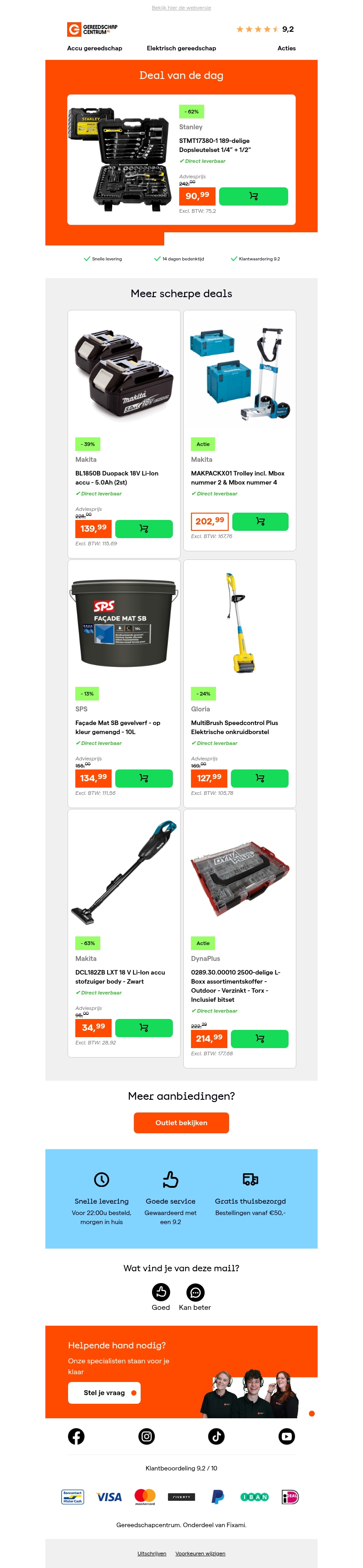 Ontdek de deal van de dag met een flinke besparing van 62% op de Stanley STMT17380-1 Dopsleutelset. Deze set bevat 189 delen en is perfect voor diverse klussen. Profiteer van gratis verzending bij bestellingen boven de €50 en kies voor snelle levering. De aanbieding geldt zolang de voorraad strekt. Bestel vandaag nog en mis deze kans niet!