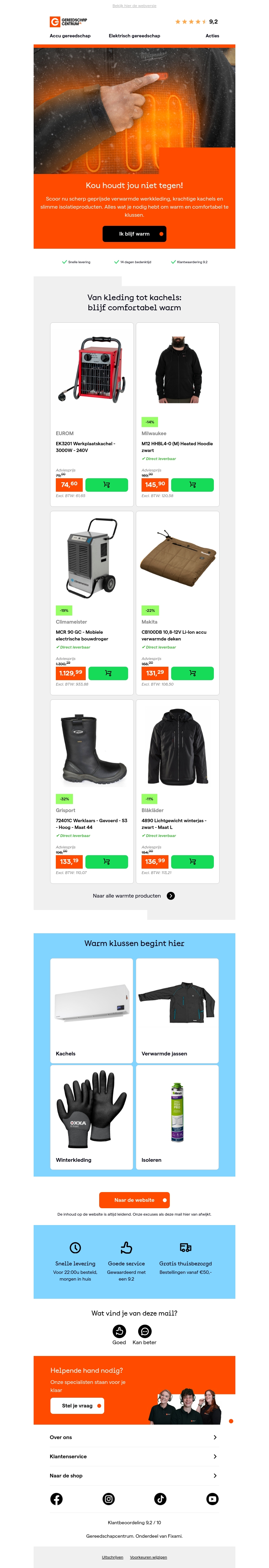 Bereid je voor op koude winterdagen met onze nieuwste collectie van verwarmde kleding en efficiΓ«nte kachels. Met producten van topkwaliteit, zoals de warme winterhoodie en krachtige mobiele kachels, blijf je gegarandeerd comfortabel tijdens elke klus. Profiteer van onze snelle levering en uitstekende service om jouw wintervoorbereidingen eenvoudig te maken.