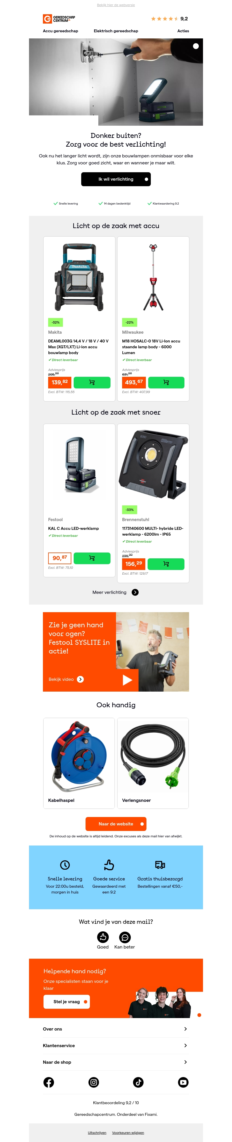 Ontdek in onze nieuwsbrief de nieuwste verlichtingstools die perfect zijn voor elke klus. Zorg voor voldoende licht met onze bouwlampen en werklampen zodat je veilig en efficiënt kunt werken. Profiteer van scherpe prijzen en snelle levering. Bekijk de video voor meer informatie over de Festool SYSLITE. Bestel vandaag nog en ervaar onze uitstekende service.