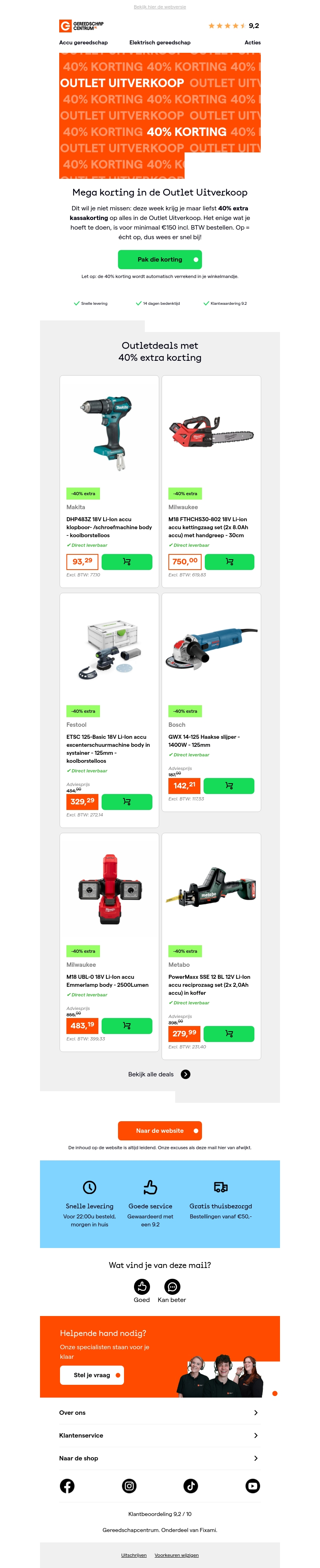 Mis deze week niet de kans om 40% extra kassakorting te ontvangen op alle producten in de Outlet Uitverkoop. Deze aanbieding geldt voor bestellingen van minimaal €150. Haast je om geweldige deals te scoren op topmerken zoals Makita, Milwaukee, Festool, Bosch en Metabo!