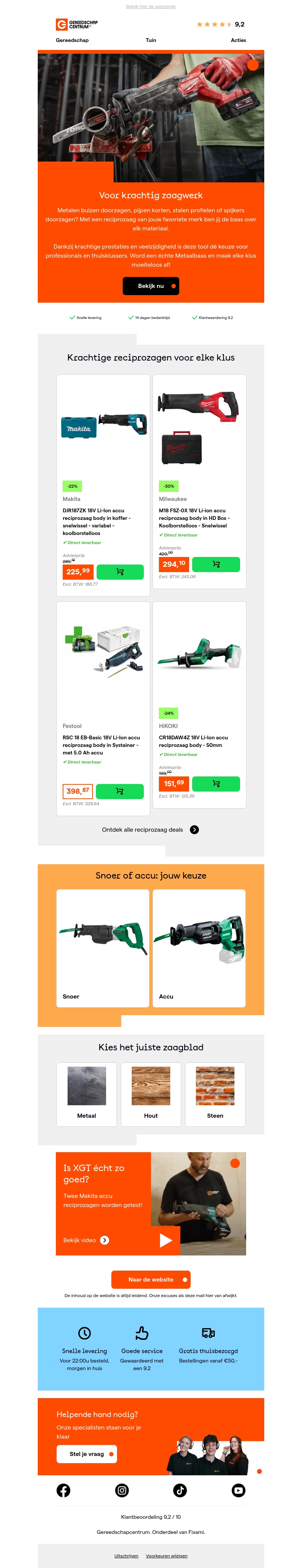 Deze nieuwsbrief richt zich op krachtige reciprozaagmodellen voor elke klus. Ontdek diverse aanbiedingen van je favoriete merken zoals Makita en Milwaukee. Maak een keuze uit modellen met snoer of accu, en kies het perfecte zaagblad voor materiaal als metaal, hout, of steen. Bekijk ook een video met een Makita gereedschapstest. Profiteer van gratis levering en deskundig advies.