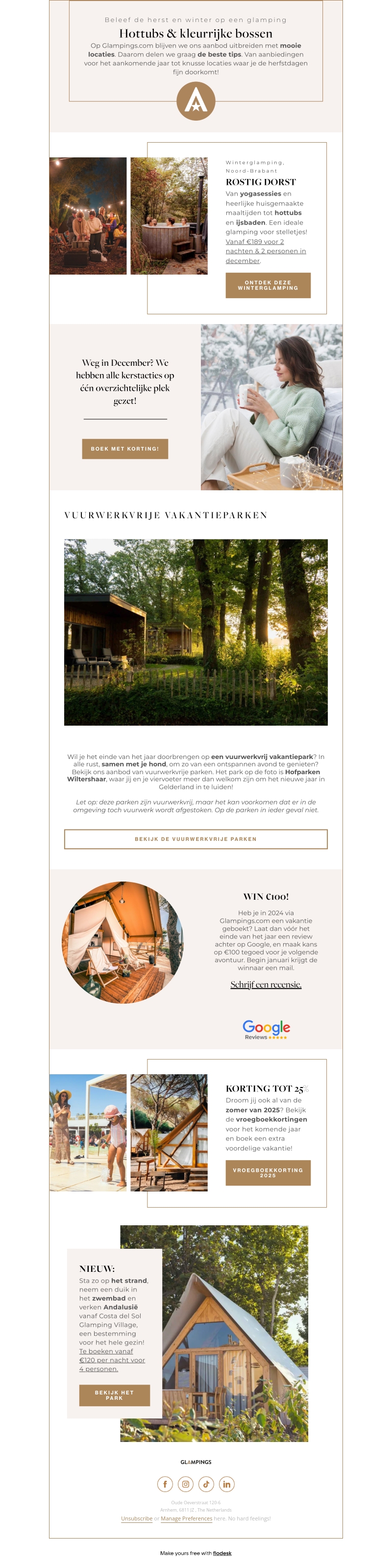 Beleef dit najaar en winter het avontuur bij Glampings. Geniet van winterglamping met hottubs en yogasessies in Noord-Brabant. Ontsnap aan het vuurwerk in rustige vakantieparken. Neem een voorproefje op de zomer van 2025 met vroegboekkorting en ontdek de schoonheid van AndalusiΓ«.